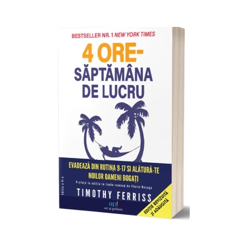4 Ore - Saptamana de lucru / The 4 Hour Workweek de Timothy Ferriss este mai mult decat o carte, este un fenomen international care a schimbat vietile multor oameni. Autorul iti ofera prin intermediul acestei carti, devenita bestseller si ajunsa pe primul loc in topul New York Times, designul unui stil de viata ideal. Adica, o viata in care sa ai timp liber suficient, sa poti calatori si face ceea ce iti place, dar, in care, sa si muncesti si sa castigi mai multi bani decat atunci cand jobul constituia principala ta preocupare.