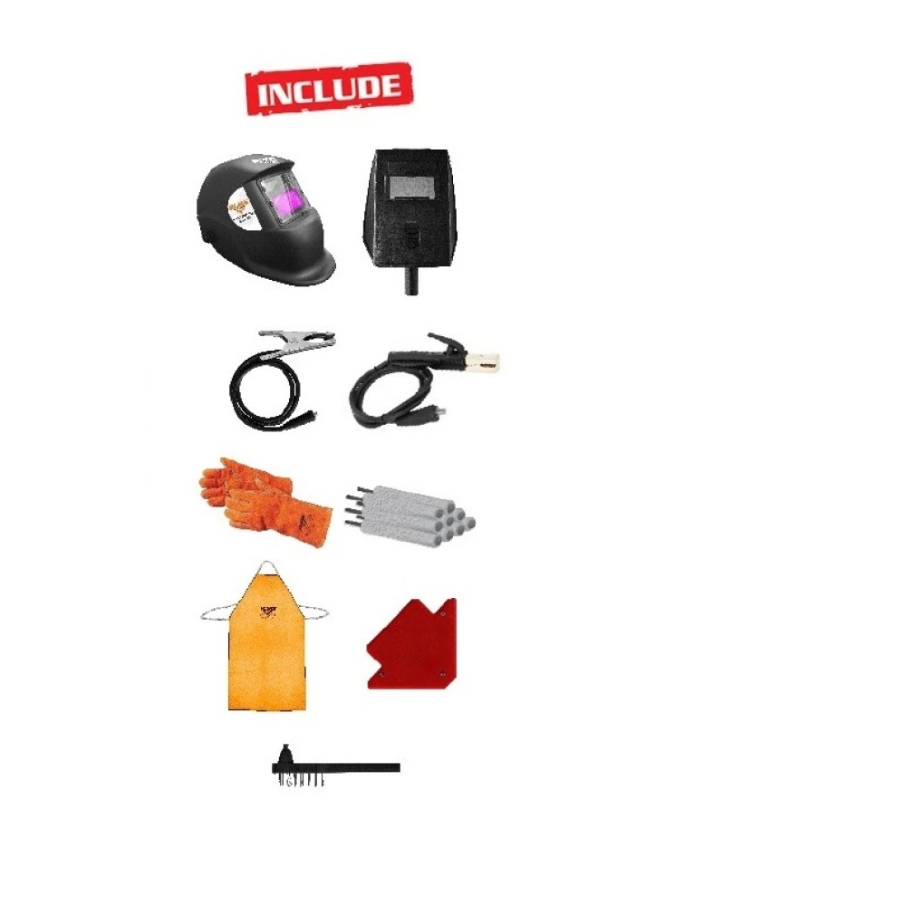 Accesorii incluse: Masca sudura, Masca sudura profesionala, Ciocan/perie sarma, Cle?te de masa, Cle?te portelectrod, Electrozi rutilici 3,2mm 2,5kg, Manu?i sudura, ?ort sudura, Echer magnetic