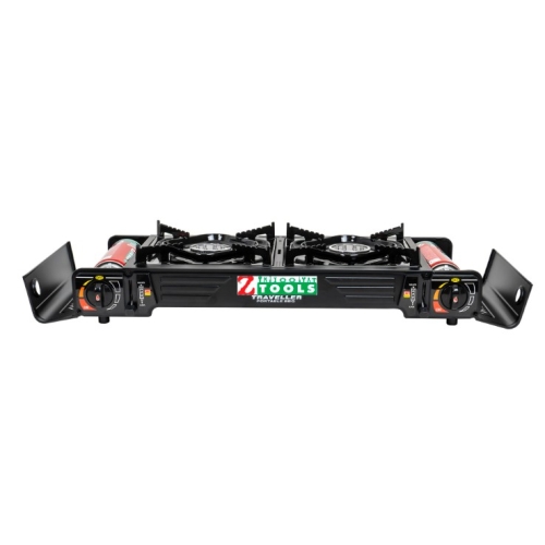 Aragaz camping cu 2 ochiuri, aprindere electrica, putere 2×2.3kw, cu tava gril, spatula, cleste si cutie de transportat