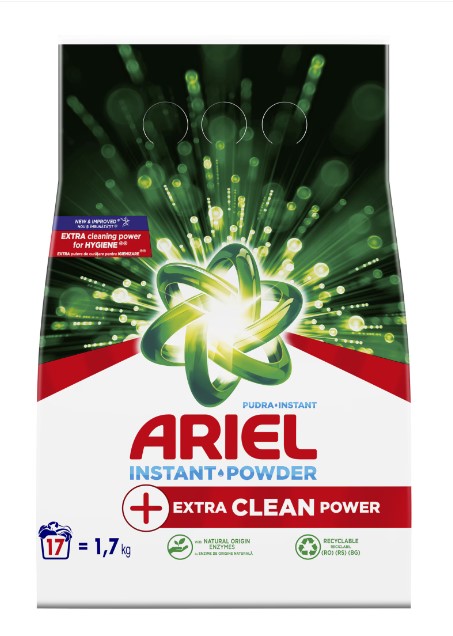 Detergentul pudra Ariel +Extra Clean Power cu tehnologia Instant Powder aduce curatarea la urmatorul nivel: formula sa contine agenti suplimentari de indepartare a petelor, oferind cea mai intensa putere de curatare Ariel. Formula inovatoare Instant Powder se dizolva rapid in contact cu apa, se activeaza instantaneu si patrunde adanc in fibre pentru a lasa hainele impecabile.