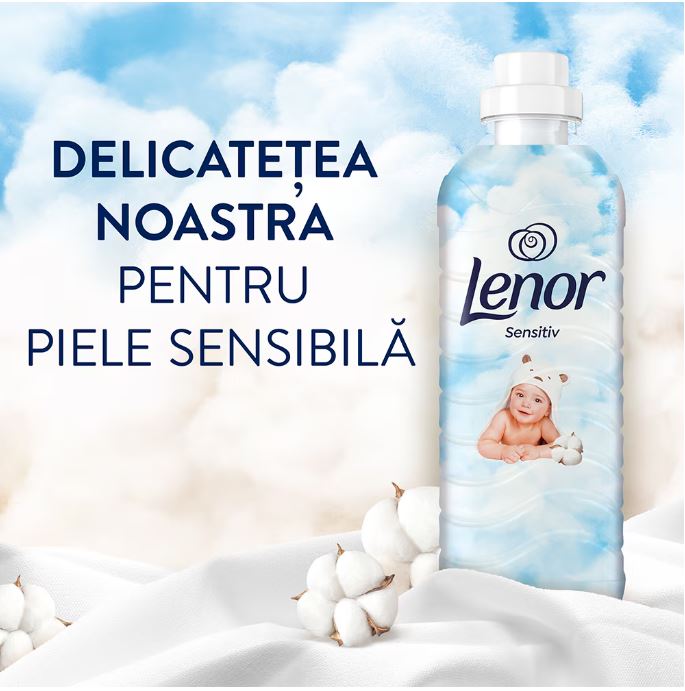 Bucura-te de catifelare si un parfum delicat de bumbac, special conceput pentru pielea sensibila, cu balsamul de rufe Lenor Sensitive.
