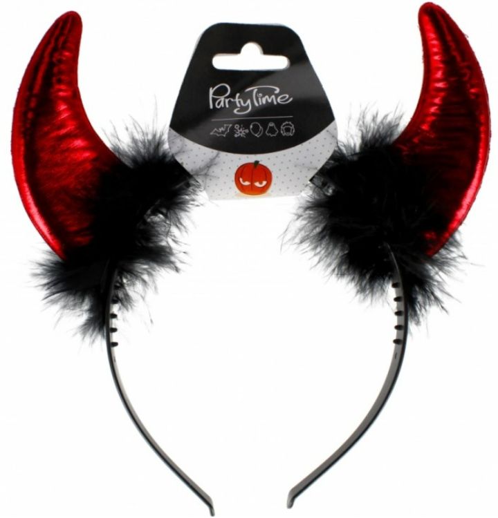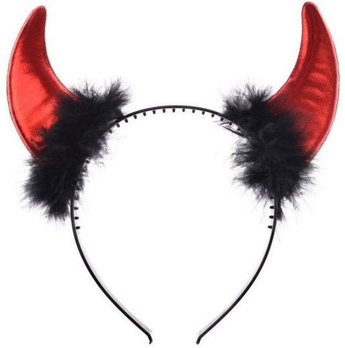 Coarne roșii, strălucitoare, din material metalic, montate pe o bentiță. Un finisaj decorativ cu pene negre delicate a fost adăugat acolo unde cornul se conectează la bentita. Parte dintr-un costum de Halloween, bal de carnaval sau un gadget de sine stătător. Dimensiunea benzii este de 21 cm.