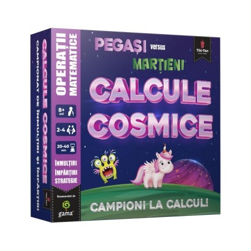 Invata sa inmultesti si sa imparti intr-un mod distractiv Martienii si pegasii au intrat intr-un razboi matematic iar tu esti singurul care poate decide castigatorul Rezolva cat mai repede operatiile de pe carduri gaseste rezultatul corect pe placa de joc si plaseaza-ti strategic jetoanele. Fii primul care plaseaza patru jetoane alaturate si devino campion la calcule Si nu uita cu cat calculezi mai repede in minte cu atat mai usor iti va fi si la scoala. Cutia contine placa de joc jetoane in patru culori carduri cu inmultiri si impartiri.