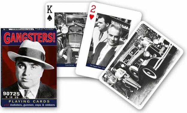 Pachet cu 55 de carti de joc de colectie (52 de carti de joc + 2 jokeri + o carte descriptiva), fiecare carte de joc avand ca background cate un poster sau o fotografie cu gangsteri celebri, politisti, sau scene de epoca.