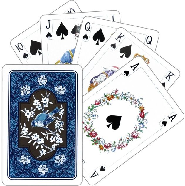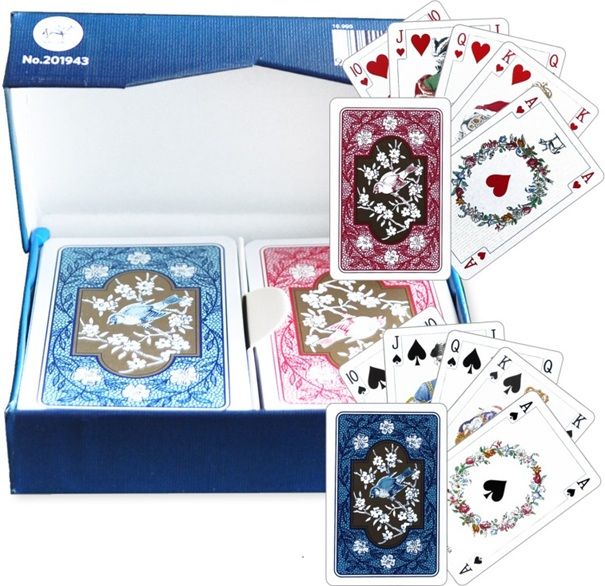 Cutia, cu finisaj deosebit, contine 2 pachete de carti de joc, unul cu spate rosu cu auriu, celalalt cu spate albastru cu auriu.