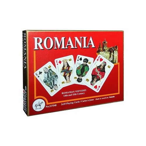 Carti de joc de lux cu tema Romania si figuri de domnitori romani doamne si printi din secolele XIV si XV. Ii veti intalni cand jucati pe Vlad Tepes Stefan cel Mare Mihai Viteazu si Iancu de Hunedoara dar si pe doamnele Stanca Elena Florica si sotia lui Bogdan Voda. Pe verso-ul cartilor de joc se gaseste prima stema a Principatelor unite la 1601 sub domnia lui Mihai Viteazu. Pe fundalul cutiei se poate vedea Castelul Bran. Se poate juca orice joc cu carti Canasta Whist Bridge Poker etc. Cutia cu finisaj deosebit contine 2 pachete de carti de joc unul cu spate rosu celalalt cu spate negru. Cartile de joc sunt de calitate din carton plastifiat rezistent la uzura placut la atingere. Un cadou deosebit