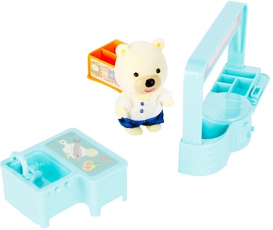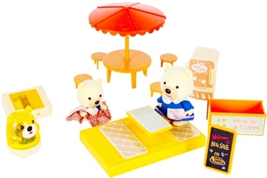Setul include: restaurant cabana, mese, scaune, umbrela, gratar, frigider, 4 figurine de ursuleti.