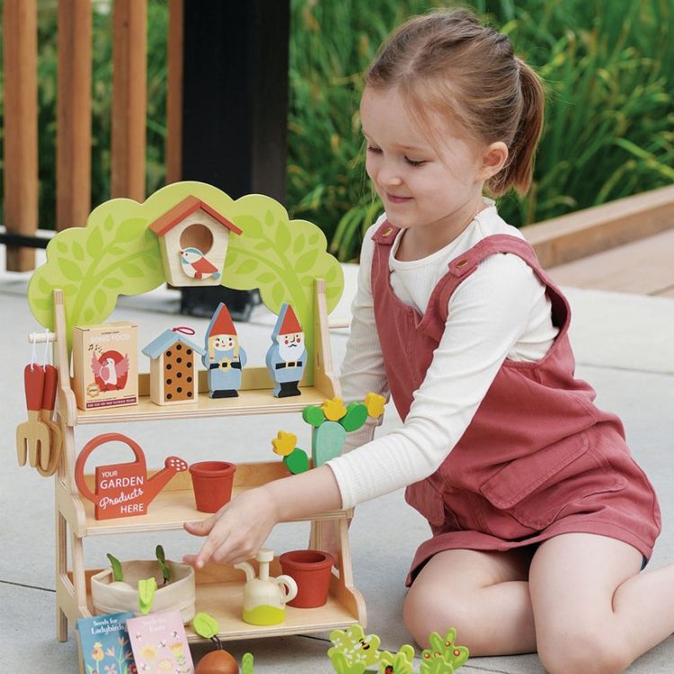 Standul colorat are 3 rafturi si 3 agatatori pentru a expune toate accesoriile incluse. Setul contine o lopatica, o furculita, o foarfeca de gradina, o casuta pentru pasari cu un piotru albastru, o casuta pentru insecte, o tavita cu rasaduri, un saculet cu 5 bulbi din material textil si lemn de plantat, 2 ghivece in stil teracota, un pulverizator, o stropitoare si o planta in crestere in stil cactus. Nu lipsesc nici simpaticii pitici de gradina, domnul si doamna Gnome! Pentru joaca suplimentara, setul include o cutie de seminte pentru pasari si 3 plicuri de seminte pe care le poti construi si umple cu seminte adunate de tine.