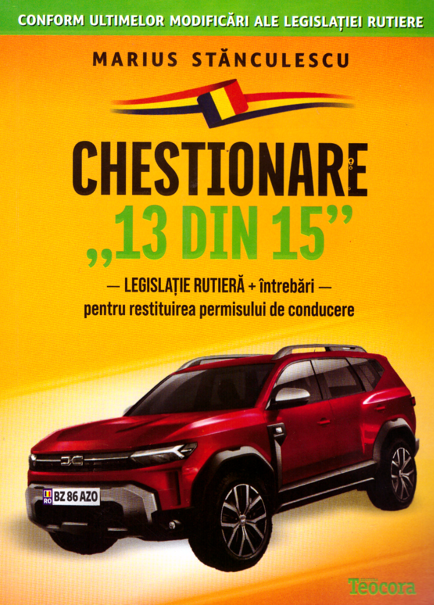 Cartea scrisa de Marius Stanculescu, „Chestionare 13 din 15 – Legislatie rutiera si intrebari pentru restituirea permisului de conducere”, cuprinde notiuni necesare fiecarui conducator auto. De-a lungul timpului, legislatia rutiera a fost modificata de mai multe ori, motiv pentru care conducatorii auto nu cunosc pe deplin toate schimbarile aparute. Prin cartea sa, autorul se adreseaza unui public larg, incluzand persoanele ce doresc sa-si reimprospateze cunostintele, cat si cele ce se axeaza pe aprofundarea informatiilor dobandite anterior. Chestionare 13 din 15 – Legislatie rutiera si intrebari pentru restituirea permisului de conducere este o carte ce se adreseaza tuturor posesorilor de carnet de conducere, nu doar celor ce au ca scop redobandirea acestuia. Autorul reuseste sa-si sintetizeze cunostintele, structurandu-le in carte sub forma unor capitole ce includ notiuni de baza, imagini in scop explicativ, iar la sfarsit sunt introduse chestionarele cu scopul evaluarii informatiilor acumulate anterior.