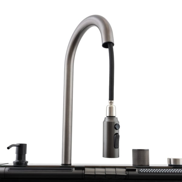 Chiuveta vine echipata cu racorduri si baterie monocomanda din inox, cu cartus ceramic, pentru o utilizare indelungata si sigura. Toate accesoriile sunt gandite pentru a se integra perfect si pentru a transforma chiuveta intr-o statie de lucru completa.