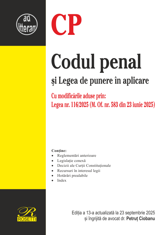 Prezenta editia a lucrarii Codul penal si Legea de punere in aplicare, contine textele legislative actualizate la 23 septembrie 2025, adnotate cu: reglementarile anterioare, decizii ale Curtii Constitutionale, recursuri in interesul legii si hotarari prealabile.
