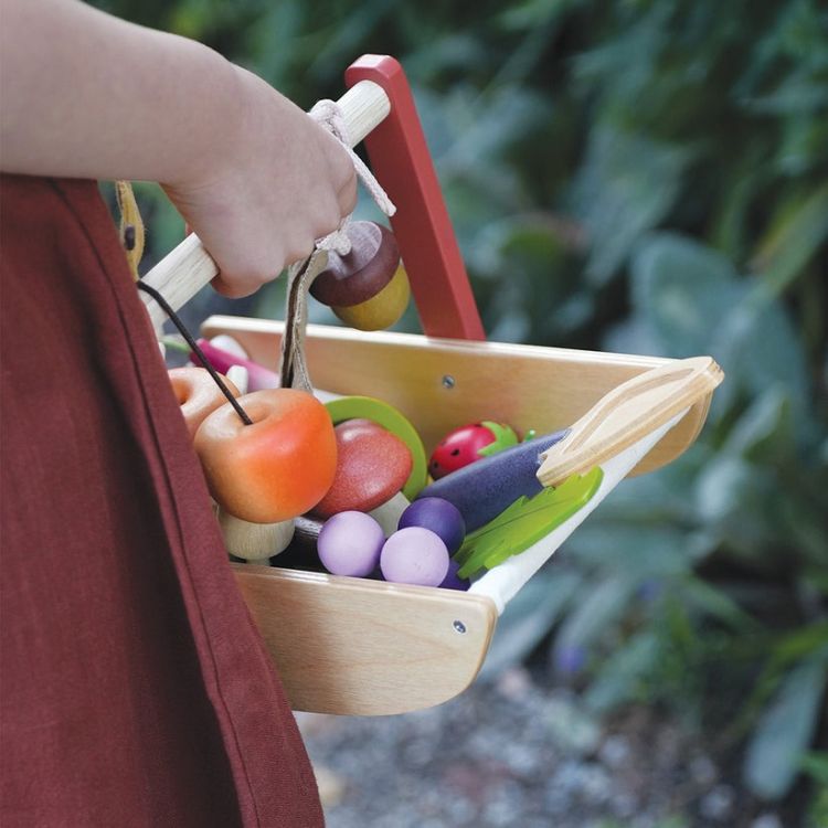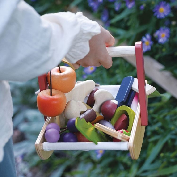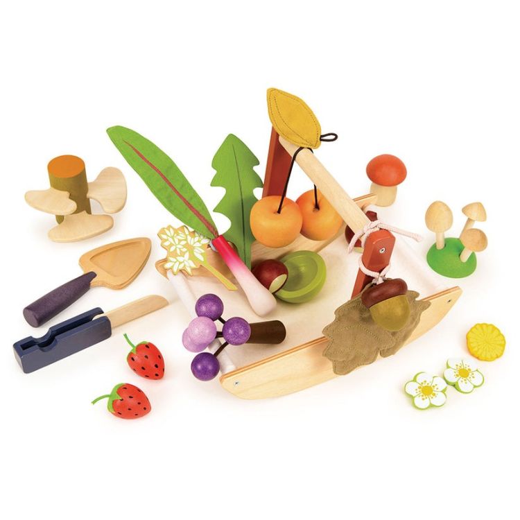Cos de cules Wild Wood, din lemn premium este un set de joaca cu un cosulet din lemn si material textil, plin cu plante, ciuperci, flori si fructe de padure – toate inspirate din comorile naturii. Include un cutitas pliabil pentru taiat crengute si o lopatica pentru cautat ciuperci. In cos se gasesc delicii comestibile si populare care pot fi "culese" pe tot parcursul anului: 2 mere padurete, 2 fragute de padure si 2 flori, leurda si flori, 3 ciupercute mici si un hrib, fructe de padure, frunza si floare de papadie, 3 ciuperci de copac pe un trunchi, o castana comestibila si o ghinda cu frunze.