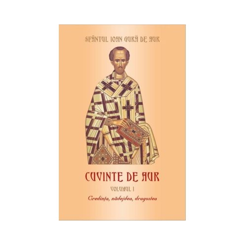 Primul volum al seriei Cuvinte de aur ale Sfantului Ioan Gura de Aur cuprinde cele trei virtuti teologice tripticul vietii duhovnicesti credinta nadejdea si dragostea. Credinta constituie trasatura fundamentala a crestinului. Fara credinta este cu neputinta ca omul sa fie bineplacut lui Dumnezeu . Trebuie insa ca aceasta credinta sa fie statornica si nezdruncinata si sa se sprijine pe Stanca nesurpata a credintei pe Domnul nostru Iisus Hristos. Credinta fara nadejde nu poate sa existe. Credem si nadajduim Daca agricultorul trudeste si nadajduieste la fel si corabierul si negustorul si aceasta pentru lucruri care sunt nesigure si neschimbatoare cu mult mai mult trebuie sa trudeasca crestinul si sa aiba sperante si nadejdi care niciodata nu sunt dezmintite. Dragostea este trasatura comuna a lui Dumnezeu si a oamenilor. Fara dragoste nici martiriul nu poate sa ne foloseasca. Iubirea a facut cerul pamant L-a facut pe Dumnezeu om ca omul sa devina Dumnezeu. Ceea ce-l aseamana pe om cu Dumnezeu mai mult decat toate este iubirea fata de vrajmasi. Cea mai frumoasa coarda a lirei este cea care interpreteaza melodia care se numeste iubire de vrajmasi. Noi in ce stare si in ce treapta a iubirii ne aflam Sa cercetam si sa aflam raspunsul de la Invatatorul cu Gura de Aur al Bisericii noastre.