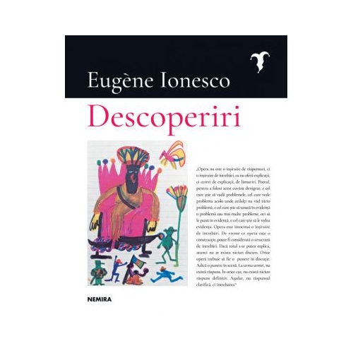Opera nu este o insiruire de raspunsuri ci o insiruire de intrebari ea nu ofera explicatii ci cereri de explicatii de lamuriri. Poetul pentru a folosi acest cuvant denigrat e cel care stie sa vada problemele cel care vede problema acolo unde ceilalti nu vad nicio problema e cel care stie sa scoata in evidenta o problema sau mai multe probleme ori sa le puna in evidenta e cel care stie sa le redea evidenta. Opera este intocmai o insiruire de intrebari. De vreme ce opera este o constructie poate fi considerata o structura de intrebari. Daca totul s-ar putea explica atunci nu ar exista niciun discurs. Orice opera trebuie sa fie o punere in discutie. Adica o punere in scena. La urma urmei nu exista raspuns. In orice caz nu exista niciun raspuns definitiv. Asadar nu raspunsul clarifica ci intrebarea. Ma vad in pozele mele de cand eram copil cu ochii rotunzi uimiti ca exista. Nu m-am schimbat. Uimirea initiala mi-a ramas. In Descoperiri pentru prima oara tradusa in limba romana Eug ne Ionesco ne arata desenele lui impregnate de o nota naiva ne vorbeste despre perioada lui de formare ne invita in universul lui intim ne prezinta amintiri tulburatoare care l-au insotit toata viata. Scrisul lui de mana forme texturi si culori toate acestea creeaza un adevarat carusel de emotii. Pentru Ionesco a scrie inseamna a cauta a cauta...