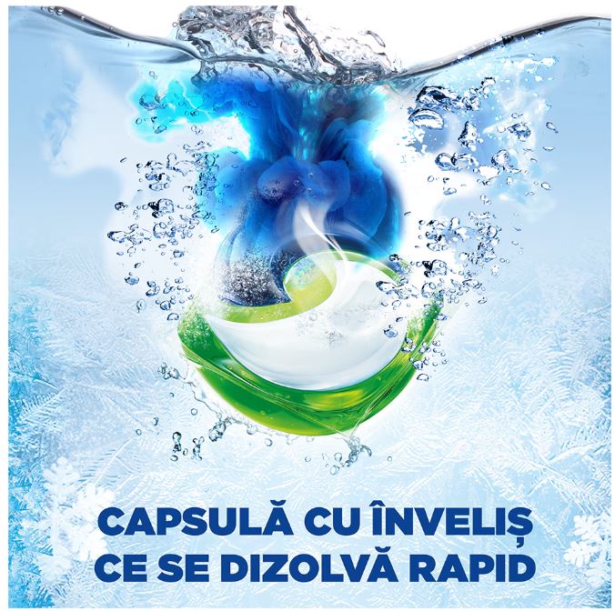 Detergentul de rufe capsule Ariel Allin1 Color ofera o putere exceptionala de indepartare a petelor, de la prima spalare, chiar si la temperaturi scazute si la program scurt datorita tehnologiei Cool Clean.