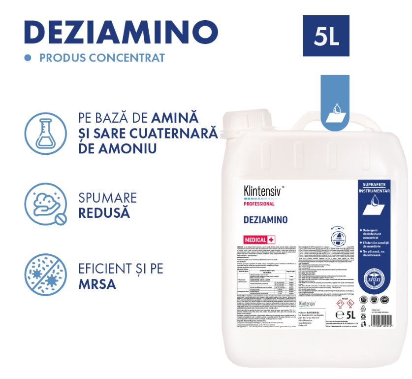 DEZIAMINO este un detergent lichid concentrat cu spectru larg de eficacitate biocidă, destinat curățarii și dezinfectării suprafețelor dure de diverse tipuri din unități medicale (spitale, clinici, cabinete medicale, ambulanțe, unități primiri urgențe, unități medicale mobile ș.a.) sau instrumentarului medical.