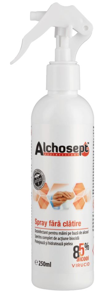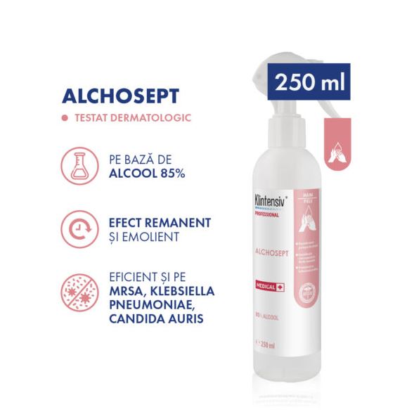 ALCHOSEPT este o soluție hidroalcoolică utilizată pentru dezinfectarea igienică și chirurgicală a mâinilor prin frecare. Este un produs cu acțiune rapidă ce asigură o bună protecție a pielii, putând fi folosit zilnic. Eficient pe un spectru larg de microorganisme, este indicat pentru zonele cu risc mare de contaminare din unitățile medicale (zone de triaj, primiri urgențe ș.a.). Poate fi utilizat pentru dezinfectarea pielii înainte de intervenții minim invazive precum: puncții, catetere, injecții ș.a.