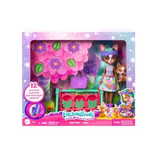 Surprinde Este colectia Enchantimals Baby Best Friends -- fiecare pachet este plin de descoperiri distractive La inceput copiii vad o papusa adorabila Enchantimals de 15 cm cu o coafura si o tinuta distractive impreuna cu animalul ei de companie langa un copac colorat cu frunze si flori. Ei vor fi apoi incantati sa deschida frunzele si florile pentru a descoperi trei animale mici si noua accesorii pentru bebelusi. Fiecare set are un total de 12 surprize Toate accesoriile functioneaza cu fiecare animal mic si pot fi combinate pentru si mai multa joaca. De asemenea sunt incluse un marsupiu si o geanta pentru scutece Copiii vor dori sa detina intreaga colectie Fiecare produs se vinde separat in functie de disponibilitate. Culorile si modelele pot varia. Include 1 papusa cu haine detasabile 1 figurina de animal 1 marsupiu 1 geanta pentru scutece 3 figurine de animale mici 9 accesorii. Acest set contine personajele Crizia Corgi si Snow.