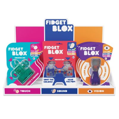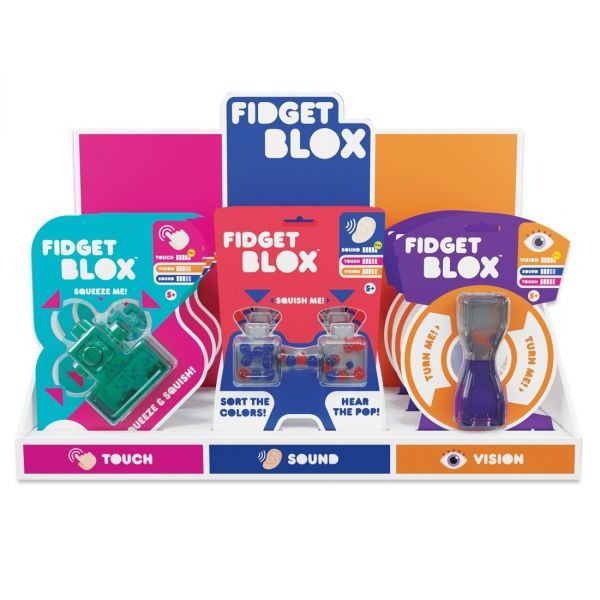 Fidget Blox sunt moi, senzoriale si extrem de satisfacatoare. Fidget Blox este disponibil in trei modele diferite, fiecare cu un focus unic pe: atingere (strange si apasa), sunet (bilute umplute cu apa) si efecte vizuale (efect de lava).