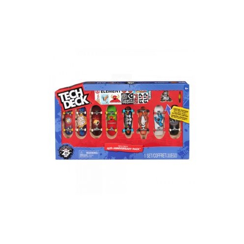 Fa o calatorie in timp cu pachetul de 8 fingerboard-uri Tech Deck aniversare editia a 25-a. Tech Deck sarbatoreste un sfert de secol de cand aduce in mainile tale autentice fingerboard-uri de la cele mai cunoscute companii de skate. Acest pachet aduce grafica autentica din istoria Tech Deck reprezentand marci precum World Industries Flip Blind Toy Machine si multe altele. Experimenteaza forme clasice si indragite ale placilor de skate. Doar in acest pachet primesti si un Tech Deck Dude original intr-o editie speciala stralucitoare Silver Collector Edition. Personalizeaza-ti placile cum fac profesionistii folosind autocolantele si instrumentul inclus in pachet. Prinde-ti valul si fa grind-uri pe cele mai noi skateboard-uri fingerboard din seria X-Connect. Poti construi si seturile de rampe Pyramid Shredder sau Speedway Hop se vand separat pentru a-ti distrage puntile de skateboard.