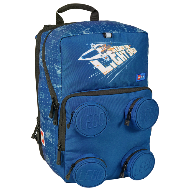 Ghiozdanul stcolar LEGO - Petersen - este un model emblematic, usor de recunoscut datorita buzunarului frontal ce imita o piesa LEGO 2x2 supradimensionata.