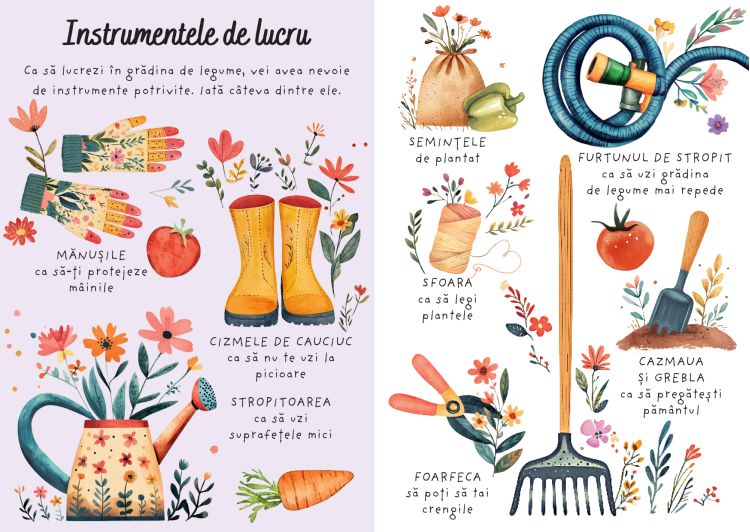 Setul ii invita pe cei mici sa exploreze lumea gradinii: legume colorate, unelte de lucru, insecte prietenoase si micile secrete ale vietii sub pamant. Pe langa puzzle si paginile de colorat magic, cartea inclusa le ofera informatii simple si frumoase despre legume, natura, culori si micile descoperiri pe care le pot face cei mici in gradina.