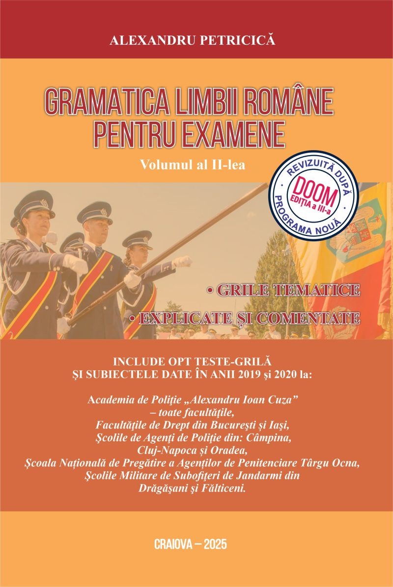 Revizuita dupa noua programa scolara si DOOM 3, contine grile actualizate pentru fiecare parte de vorbire, de propozitie si sintaxa frazei, precum si grile din Vocabular si Fonetica. Grilele sunt explicate, nu numai la raspunsul corect, cat si la celelalte variante. In acest volum se gasesc subiectele explicate si comentate date in anii 2019 si 2020 la Academia de Politie, Facultatile de Drept din Bucuresti si Iasi, Scolile de Agenti de Politie din Campina, Cluj-Napoca si Oradea, Scolile Militare de Subofiteri de Jandarmi din Dragasani si Falticeni si Scoala Nationala de Pregatire a Agentilor de Penitenciare Targu Ocna.
