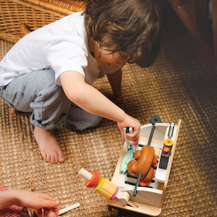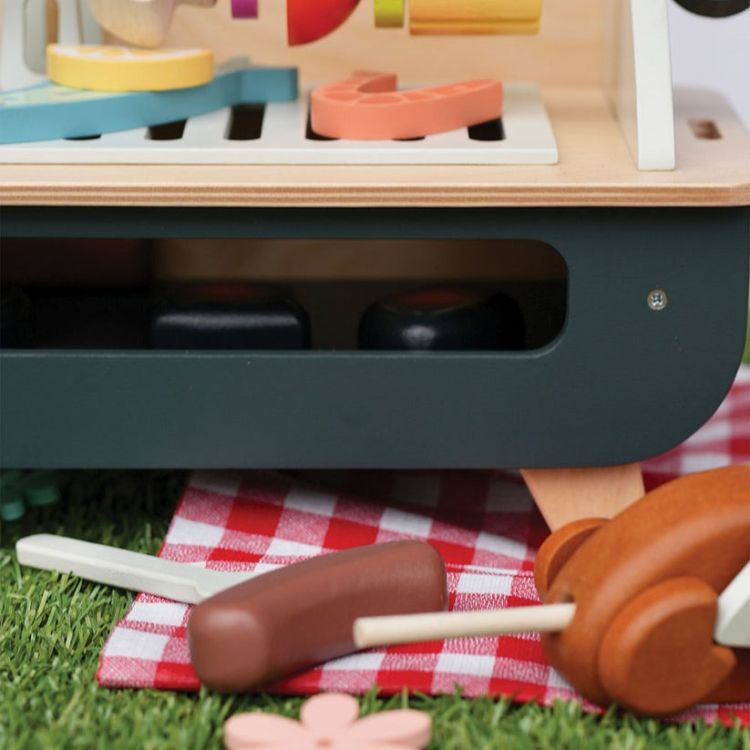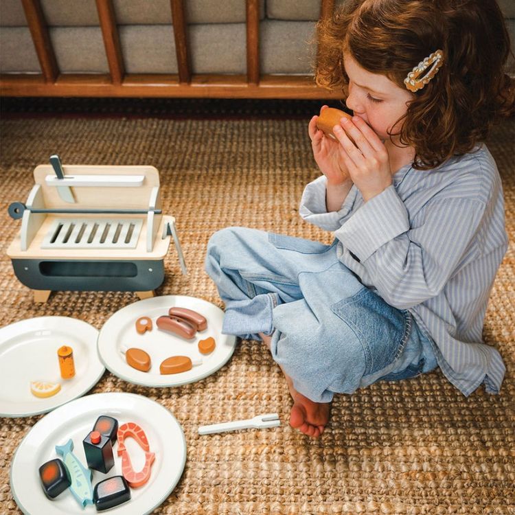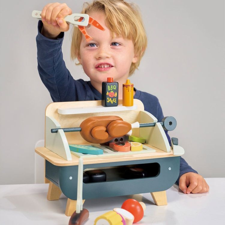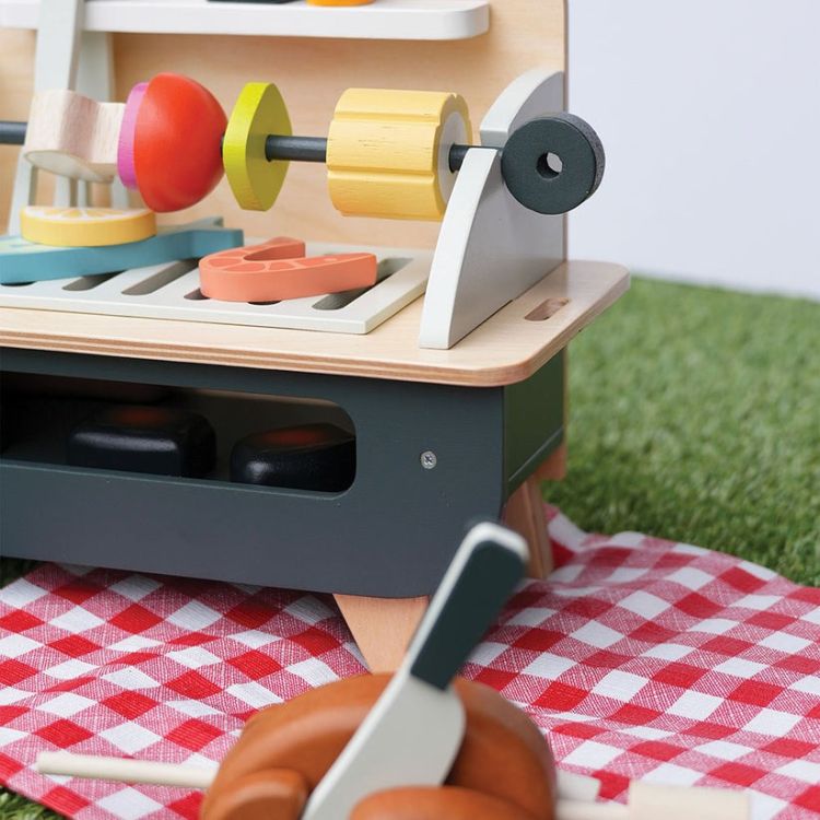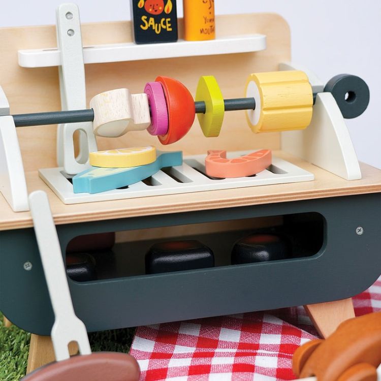 Setul de joaca cu gratar - Barbeque Play Set, din lemn premium, contine un gratar din lemn cu suport propriu, cu gratar detasabil si multe accesorii distractive: 3 carbuni care par incinsi, un pui pe rotisor format din 5 piese, 2 carnaciori cu furculita speciala, o frigaruie din lemn cu 5 legume de insirat, 2 creveti, un peste, o felie de lamaie, sos BBQ si mustar, cleste si un cutit de jucarie.