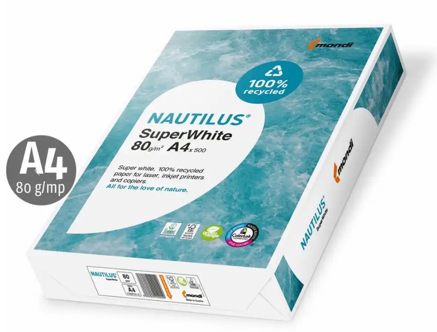 Hartie copiator reciclata, Nautilus, Super White A4, 80 g, 500 coli/top (cutie 5 topuri)