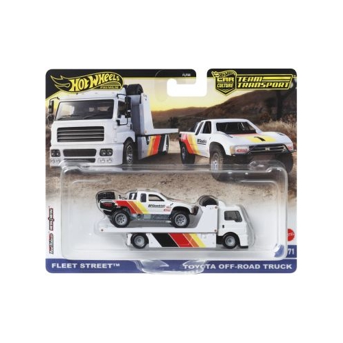 Sortimentul prezinta modele premium de transportatoare la scara 164 ce sunt cautate si indragite atat de copii, cat si de adulti colectionarii si pasionatii din intreaga lume. Realizate cu multa atentie la detalii si decoruri realiste foarte apreciate de cunoscatori. Sunt compatibile cu pistele si seturile de joaca Hot Wheels (achizitionate separat) si prind o viteza uluitoare pe pista! Transportatoarele vin impreuna cu o masina sport Hot Wheels. Fiecare se vinde separat, in functie de disponibilitate. Setul contine transporterul Fleet Street si masinuta Toyota Off Road Truck.
