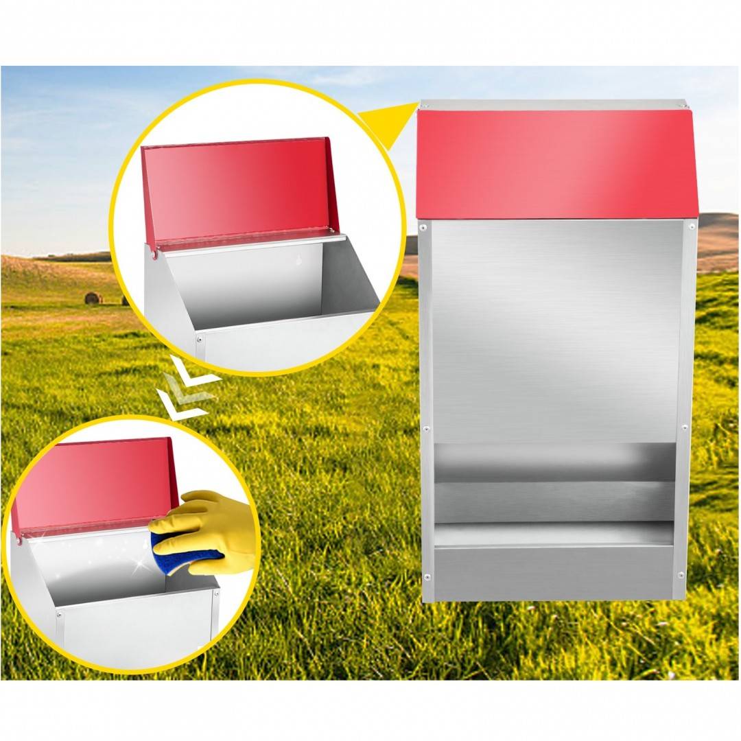 Hranitoare pentru pasari, Otel galvanizat, 35x21x45 cm, Capacitate 13.6 kg Hranitorul pentru pasari de curte poate stoca pana la 13.6 kg de hrana, care este potrivit pentru pui, prepelite, rate, gaini, si alte pasari domestice. Datorita capacitatii sale mari, nu trebuie sa adaugati hrana de multe ori la alimentator, ceea ce este foarte convenabil si va economiseste timp. Hranitorul nostru este construit din otel galvanizat, care este rezistent la apa si poate rezista mult timp in aer liber, indiferent daca este soare arzator, o furtuna usoara sau zapada. Nu este nevoie sa va faceti griji cu privire la ruginirea si prabusirea acestui alimentator pentru cosul de gaini dupa o utilizare prelungita in aer liber. Hranitorul pentru pui rezistent la ploaie are un design montat pe perete, deoarece exista gauri pre-forate pe panoul din spate. Poate fi instalat pe lemn, perete sau asezat pe un suport pentru a preveni umezirea sau murdaria hranei. Puteti alege oriunde in functie de nevoile dvs. Materialele de montare pentru hranitorul acoperit pentru pui nu sunt incluse. Hranitorul pentru pasari este convenabil de instalat si utilizat, usor de reumplut cu capac. Designul semi-inchis impiedica, de asemenea, pasarile de curte sa verse hrana pe pamant, reducand scurgerile de hrana si deseurile. Daca utilizati alimentatorul nostru pentru pui, nu trebuie sa fiti deranjat de aceste probleme. Exista un capac care se poate deschide, care vine cu hranitorul nostru pentru pasari de curte; il deschideti atunci cand doriti sa reumpleti furajul, ceea ce este usor si nu pierde mult timp. Capacul care se poate deschide este, de asemenea, convenabil pentru a curata alimentatorul pentru pui. Nu mai este nevoie sa va grabiti acasa pentru a va hrani gainile cu hranitorul nostru pentru pui. Capacitate maxima 13,6 kg Dimensiune totala: 35x21x45 cm Greutate neta 8 kg Material otel galvanizat