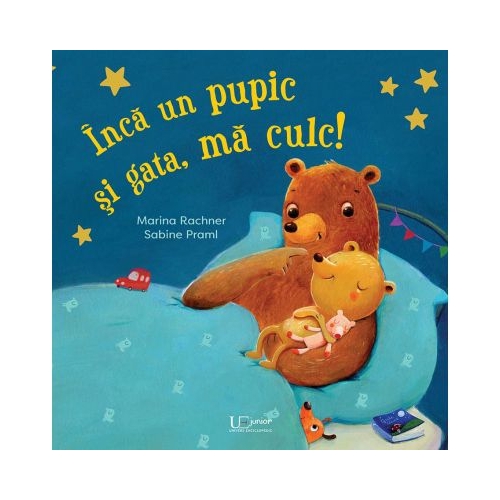 E ora de culcare. „Inca un pupic... ”, spune tata urs. „... si gata, ma culc”, spune ursuletul. Dar tot gaseste motive pentru care nu poate sa adoarma: ii este sete, e prea intuneric, nu-si gaseste animalutul de plus, iar fara un cantec de leagan nu poate sa adoarma. Si apoi trebuie neaparat sa se uite la stele. Asa ca tata urs se intinde in pat, alaturi de el...