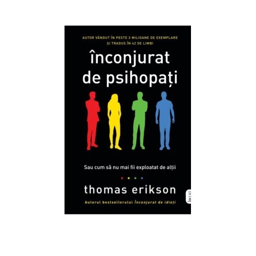 BESTSELLER INTERNATIONAL Unii oameni sunt exceptional de manipulatori. Pot convinge pe oricine de orice si pot atrage prin sarmul lor. Le place sa ii controleze pe altii si vor face tot ce le sta in putere sa obtina ce vor. Suna cunoscut Vestea proasta este ca nu poti scapa de ei. Dar iata si vestea buna ii poti bate cu armele lor. Dupa ce ne-a prezentat trasaturile bune si rele ale diferitelor tipuri de personalitate Rosu Albastru Verde si Galben in bestsellerul sau international Inconjurat de idioti expertul suedez in comportament Thomas Erikson ne va arata acum in ce fel propriile slabiciuni si trasaturi de personalitate pot fi exploatate de altii si cum ii poti opri sa o mai faca. Afland mai multe despre tipul tau de personalitate si despre cum functionezi vei putea sa intelegi comportamentele manipulative ale oricarui psihopat si sa te feresti de tentativele acestuia de a-ti provoca haos in viata. Inteligenta antrenanta si plina de informatii aceasta carte va va da tot ce aveti nevoie pentru a va descurca cu cei mai abili manipulatori si a identifica psihopatii care va populeaza viata... inainte de a fi prea tarziu Un ghid pentru respingerea manipulatorilor psihologici... Sfaturi extrem de sincere si usor de aplicat despre importanta faptului de a fi vigilent. Kirkus Reviews Acest indrumar usor de citit va calma fricile inarmand cititorii cu tactici practice de a combate strategiile psihopatilor. Adultii fie ca sunt la serviciu sau acasa vor beneficia de pe urma sfaturilor lui Erikson despre cum sa recunoasca si sa inteleaga diferitele comportamente dar si despre cum sa recunoasca semnalele de alarma in toate tipurile de relatii. Booklist THOMAS ERIKSON este expert suedez in comportament speaker extrem de activ si autor de bestselleruri. In ultimii 18 ani a calatorit prin toata Europa tinand discursuri si seminare in suedeza si in engleza directorilor si managerilor dintr-o gama larga de companii incluzand IKEA Coca-Cola Microsoft Volvo si KIA Motors. Inconjurat de idioti a fost bestseller in Suedia de la prima sa editie din 2014. S-a vandut in peste 3 milioane de exemplare in intreaga lume din care aproape un milion doar in Suedia si a fost tradus in 42 de limbi. Pentru mai multe informatii despre autor si cartile sale vizitati www. thomaserikson. com.