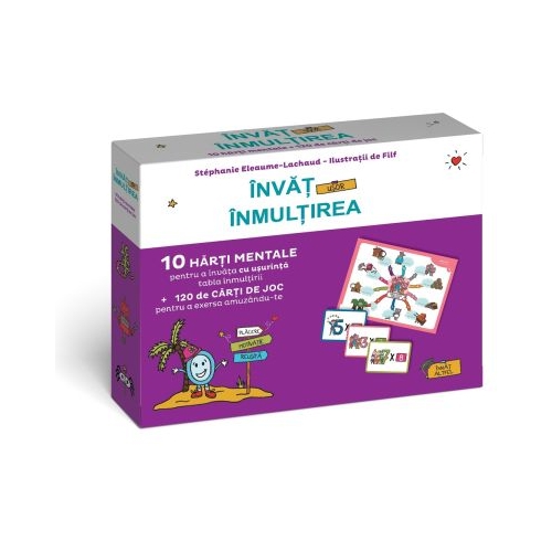 Invat usor inmultirea este un set educativ inovator care contine 10 harti mentale si 120 de carti de joc, conceput pentru a transforma memorarea tablei inmultirii intr-o activitate placuta si distractiva. Metoda se bazeaza pe povesti captivante si ilustratii care stimuleaza imaginatia copiilor, facilitand invatarea prin asociere vizuala si joc.