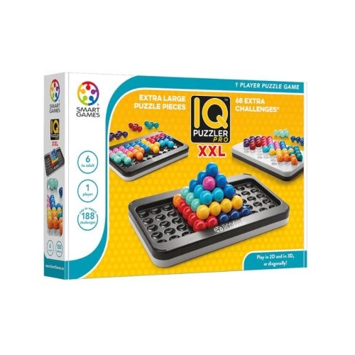 IQ Puzzle Pro XXL este joc de logica compact si portabil, din seria Smart Games, de inalta calitate, care vine intr-o cutie cu capac transparent si are 188 de provocari logice cu dificultati crescatoare, in trei moduri de joc, inclusiv provocari 2D si 3D, recomandat pentru varstele 6+, care testeaza si dezvolta abilitatile cognitive ale jucatorilor.