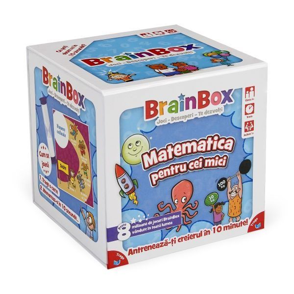 BrainBox Matematica pentru cei mici - Joc carti, educativ, copii peste 5 ani BrainBox este joc de carti distractiv de memorie si observare, testand atentia la detalii. Ce iti poti aminti in doar 10 secunde? Aceasta editie de joc pentru matematica iti ajuta copilul sa aiba un bun inceput in ceea ce priveste abilitatile de calcul. BrainBox Matematica pentru cei mici contine 55 de carti de joc bazate pe programa scolara, reprezentand diferite elemente de matematica, de la numarare si adunari la forme si fractii si multe altele. Fiecare carte de joc prezinta ilustratii desenate de mana, pentru a contribui la explicarea elementului din programa scolara de matematica prezentat cu mai multe exemple. Jocul ii ajuta pe copii sa-si dezvolte abilitatile de calcul si, cel mai important, increderea la matematica, dezvoltandu-le in acelasi timp abilitatile cognitive de observare si de reamintire, care stau la baza invatarii pe tot parcursul vietii. CONCEPTE MATEMATICE BAZATE PE PROGRAMA SCOLARA: Sprijina invatare la clasa a copiilor din Etapa cheie 1 (Anglia si Tara Galilor) cu varste intre 5 si 6 ani, cu acest joc distractiv de carti de mate 330 DE INTREBARI DESPRE MATEMATICA: Te poti bucura de joc in doar 5 sau 10 minute, dar datorita sutelor de intrebari, poti petrece ore de distractie, iar niciun joc nu va semana cu celelalte JOC INDIVIDUAL SAU IN FAMILIE: Joaca singur sau cu familia si cu prietenii. Provocarea este simpla: cat de mult iti poti aminti de pe cartea aleasa in doar 10 secunde DISTRACTIV, EDUCATIV: BrainBox Prime notiuni de mate este conceput de profesor de scoala primara ca sa fie distractiv, dar si sa consolideze concepte predare in clasa. Ofera copilului start in mate JOCUL CONTINE: 55 de carti de joc cu 330 de intrebari individuale, 1 carte cu reguli de joc, 1 zar cu 6 fete, 1 cronometru pentru zece secunde