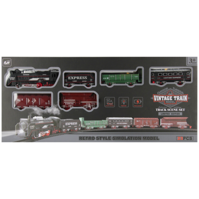 Conținutul setului: șine, 5x vagon, 1x locomotivă, accesorii de cale.
