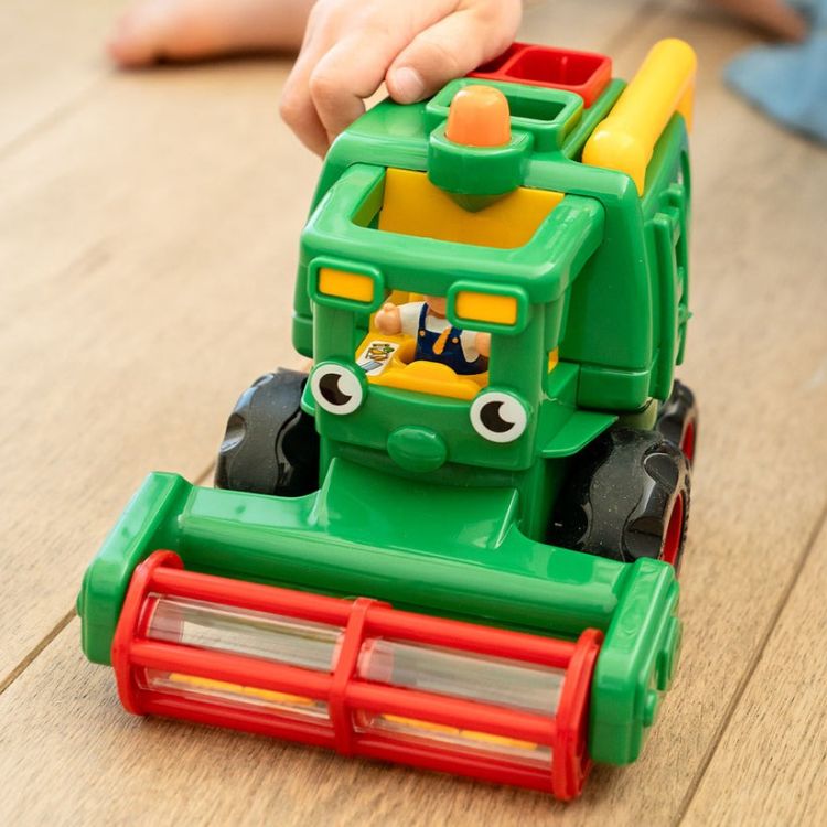 Copiii pot introduce balotii de fan in presa automata si ii pot urmari cum ies aliniati, pregatiti pentru a fi colectati din nou. Toba combinei se roteste si produce un efect sonor de boabe, iar bratul mobil pentru cereale poate fi rotit pentru a simula descarcarea recoltei.