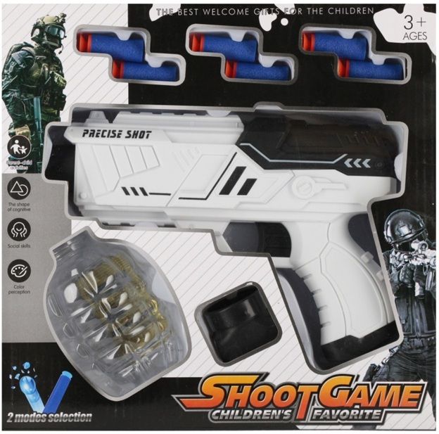 Conținutul setului: 1 x pistol, 6 x săgeți din spumă, 1 x pachet de proiectile cu apă, recipient pentru proiectile cu apă.
