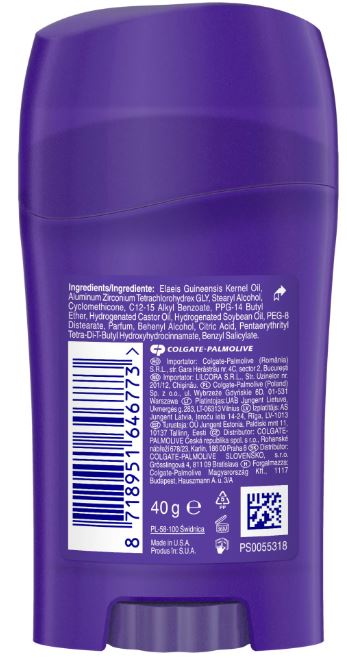 Ingrediente: Elaeis Guineensis Kernel Oil, Aluminum Zirconium Tetrachlorohydrex GLY, Stearyl Alcohol, Cyclomethicone, C12-15 Alkyl Benzoate, PPG-14 Butyl Ether, Hydrogenated Castor Oil, Hydrogenated Soybean Oil, PEG-8 Distearate, Parfum, Behenyl Alcohol, Citric Acid, Pentaerythrityl Tetra-Di-T-Butyl Hydroxyhydrocinnamate, Benzyl Salicylate.