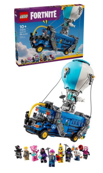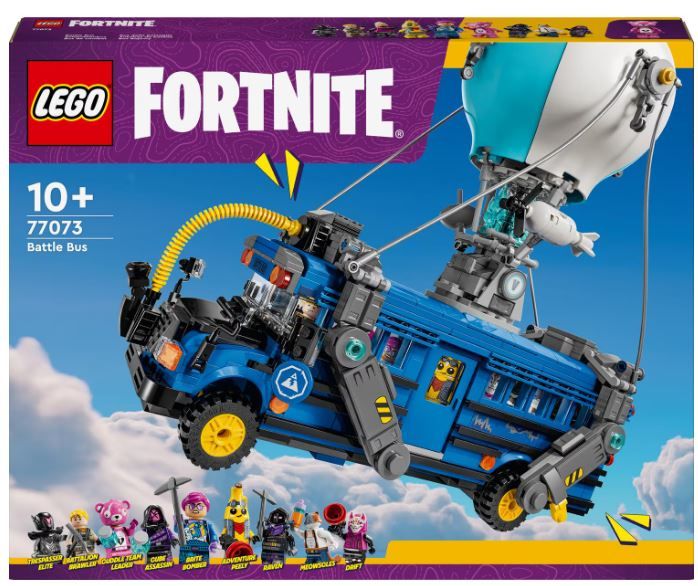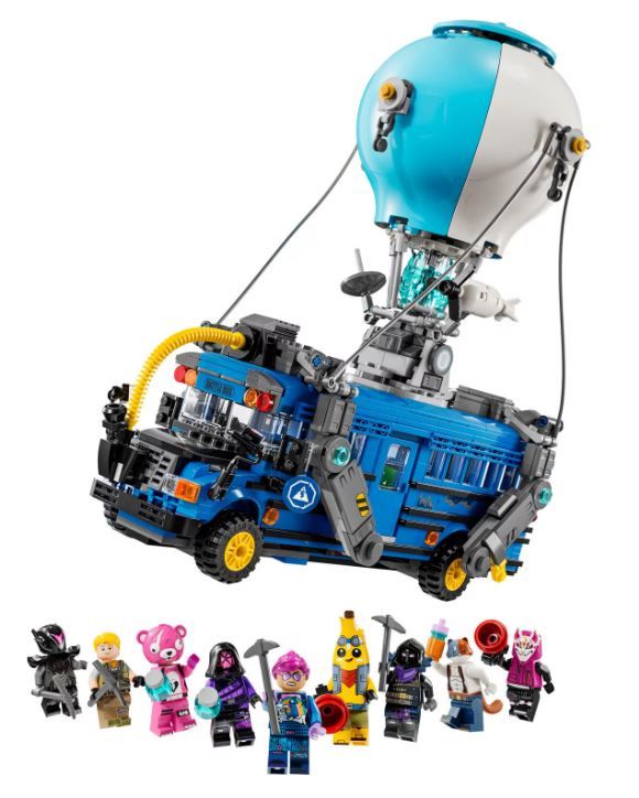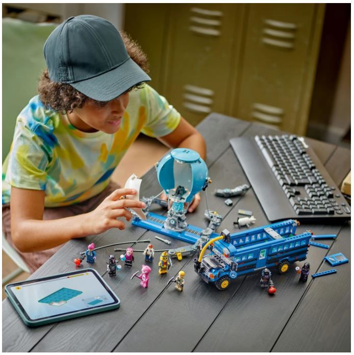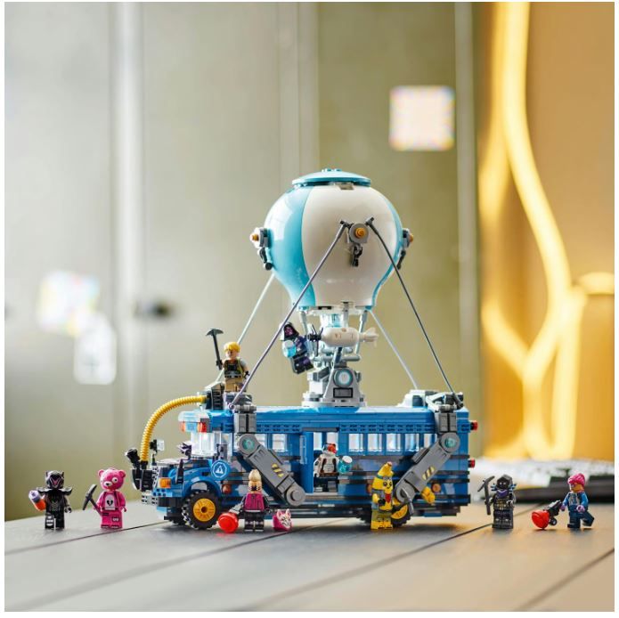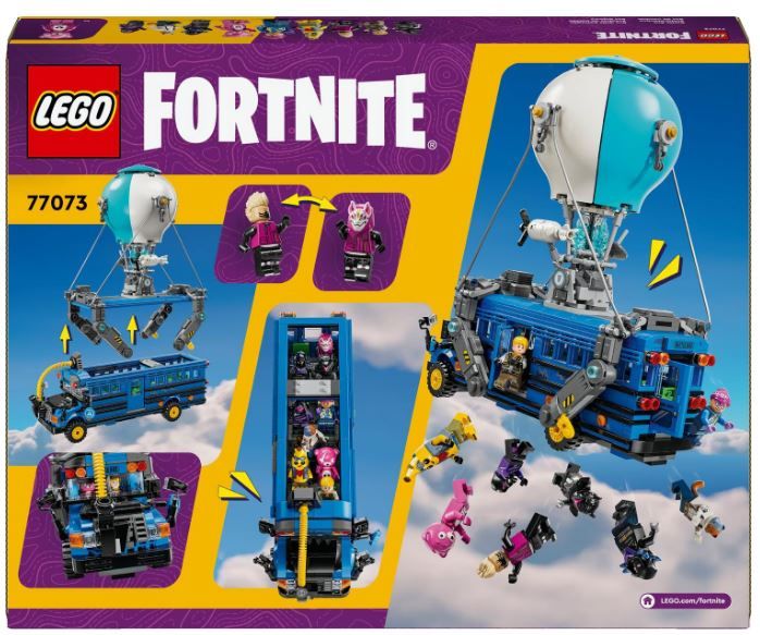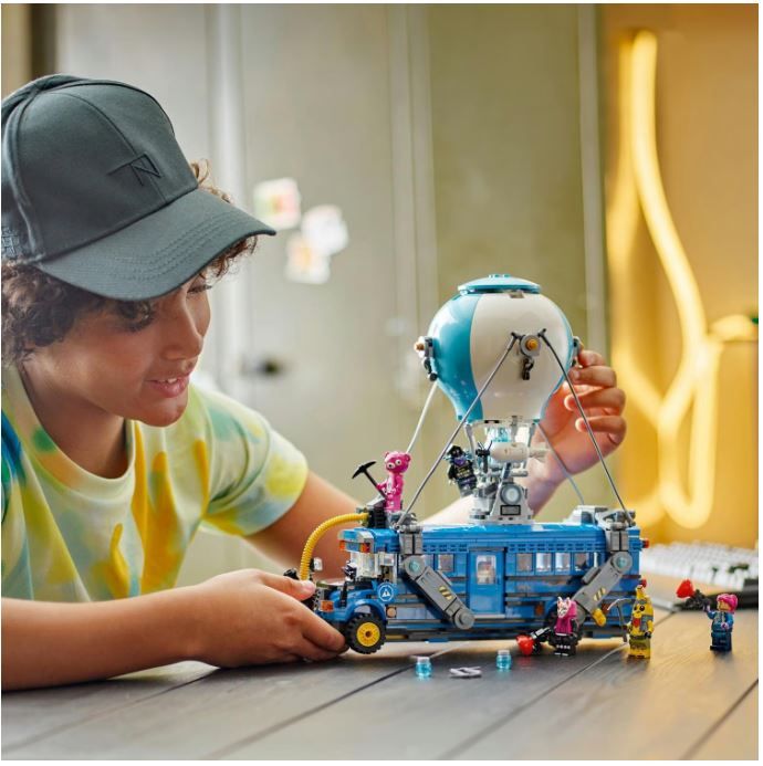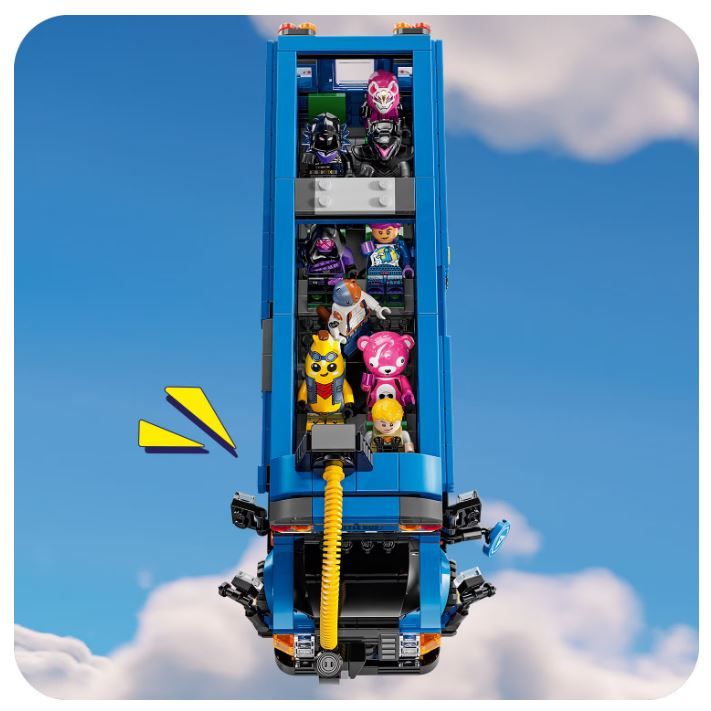 Fanii patrund in captivanta lume LEGO Fortnite pe masura ce construiesc autobuzul care are roti mobile si acoperis detasabil, precum si binecunoscutul balon cu aer cald. Dar aici e doar inceputul! Odata ce autobuzul este finalizat, acestia vor fi incantati sa descopere accesorii emblematice precum Slurp Juice, Grappler, Pickaxes si Slap Juice, precum si 9 minifigurine reprezentand costume Fortnite emblematice. Acestea dau viata aventurii si pot fi asezate in interiorul autobuzului pentru a alimenta joaca creativa pe roluri.