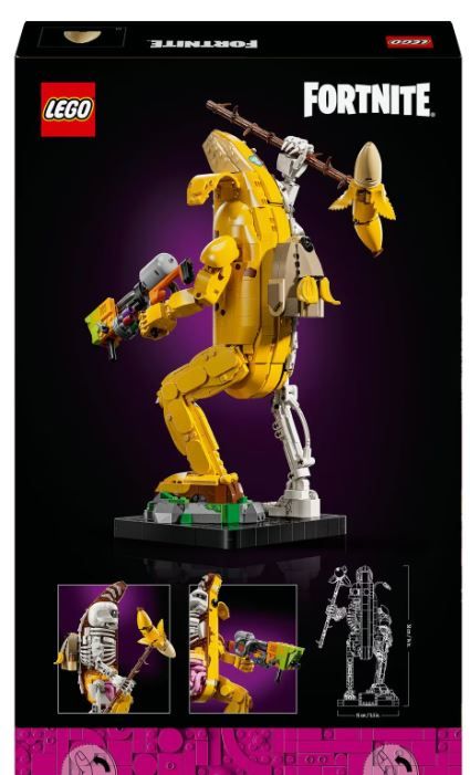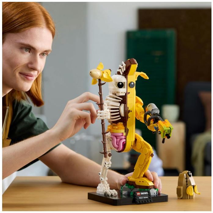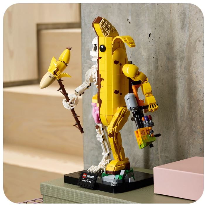 Fanii Fortnite se vor cufunda intr-o aventura in afara ecranului in care asambleaza replica din caramizi a lui Peely Bone, care este jumatate banana si jumatate schelet. Acestia vor fi incantati sa descopere bratele si incheieturile mobile ale jucariei inspirate din gaming, precum si accesoriile sale cool, intre care se numara Peely Pick Pickaxe, Paint Launcher si Banana Bag Back Bling.