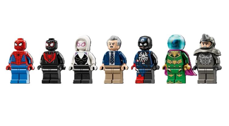 7 MINIFIGURINE – Include personajele Omul Paianjen, Miles Morales, Fantoma Paianjen, J. Jonah Jameson, Mysterio, Capitanul America Venomizat si Rhino, plus un robot si 3 tije de pozitionare transparente pentru a crea scenele de actiune aeriene