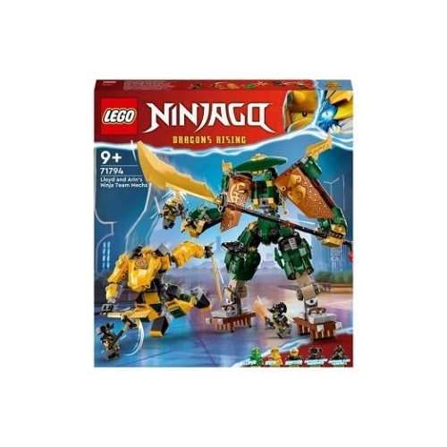Copiii de 9 ani pot interpreta scene palpitante de antrenament si lupte din seria TV NINJAGO Dragons Rising cu setul Robotii din echipa ninja a lui Lloyd si Arin 71794 . Acest set de constructie cu totul nou contine robotii articulati ai maestrului ninja Lloyd si discipolului sau Arin care pot fi combinati pentru a crea un robot mai mare si foarte inarmat pentru joaca nelimitata. 5 minifigurine pentru lupte memorabile Acest set cu robot include 5 minifigurine. Maestrul ninja Lloyd este inarmat cu 2 sabii katana iar discipolul sau Arin are 2 sabii katana si o grapina. Cei doi se lupta cu maleficul trio format din Rapton care detine o sabie imperiala comandantul garzii imperiale care are un toiag si generalul imperial Claw inarmat cu o sabie imperiala. Acest set le ofera copiilor tot ce au nevoie pentru a interpreta pe roluri nenumarate infruntari spectaculoase. Aplicatia LEGO Builder Cu aplicatia LEGO Builder tu si copilul tau veti fi ghidati intr-o aventura de constructie usoara si intuitiva. Apropie si roteste modelele in 3D salveaza seturi si monitorizeaza-ti progresul. Set unic cu 2 roboti - Fanii ninja de 9 ani pot recrea scene de antrenament si lupta din seria TV NINJAGO Dragons Rising cu setul Robotii din echipa ninja a lui Lloyd si Arin 71794 5 minifigurine - Setul ninja include minifigurinele maestrul ninja Lloyd si discipolul sau Arin care ii infrunta pe Rapton comandantul garzii imperiale si generalul imperial Claw Combina 2 roboti articulati - In premiera copiii pot combina 2 roboti pentru a crea un robot mai mare si foarte inarmat atasand robotul lui Arin de pieptul robotului lui Lloyd Mai multa actiune ninja - Cauta seturile Motocicleta de viteza robot transformator a Sorei 71792 Nucleele energetice din Templul Dragonului 71795 si alte seturi din gama LEGO NINJAGO Constructie si joaca - Acest set din 764 de piese le ofera ocazia fanilor ninja infocati sa se bucure de o constructie captivanta inainte sa infrunte fortele raului. Poate fi daruit de ziua de nastere sau oricand Model de etalat - Cand robotii sunt combinati modelul rezultat are 28 cm in inaltime si poate fi etalat in dormitoarele copiilor in pauzele de la joaca Un nou mod de a construi - Aplicatia LEGO Builder ii ghideaza pe copii intr-o aventura de constructie intuitiva. Ei pot salva seturi isi pot monitoriza progresul pot apropia si roti modelele in 3D in timp ce le construiesc Calitate superioara - De mai bine de 6 decenii caramizile LEGO au fost fabricate pentru a garanta ca se conecteaza de fiecare data Mereu in maini sigure - Caramizile de construit LEGO respecta standarde globale de siguranta. Atentie Contraindicat copiilor mai mici de 3 ani. Jucaria produsul poate contine piese mici care se pot inghiti sau inhala existand pericolul de sufocare. Nu lasati ambalajele jucariilor produselor la indemana copiilor. Indepartati orice ambalaj al jucariei produsului inainte de a da jucaria produsul copilului. Va rugam sa supravegheati copilul in timp ce se joaca foloseste acest produs. Pastrati instructiunile si etichetele pentru referinte viitoare. Pastrati jucaria produsul departe de foc feriti jucaria produsul de temperaturi ridicate si umiditate.
