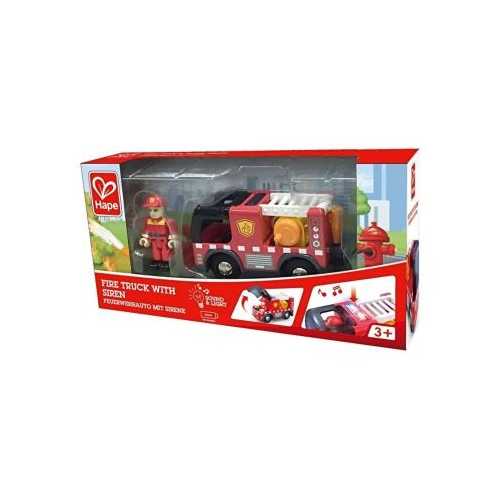 O cladire arde! Puneti lumina si sirena si conduceti acesta masina de pompieri la fata locului! Dispune de un tambur pentru furtun, scara mobila si trapa de cabina care se deschide. Apasati butonul albastru pentru a activa sirena realista. Deschideti trapa cabinei pentru a introduce si scoate pompierul. Acoperisul cabinei se deschide astfel incat figurina pompierului poate fi pozitionata si indepartata. Grad ridicat de realism Cuplajul magnetic permite conectarea cu alte jucarii cu sina Hape.