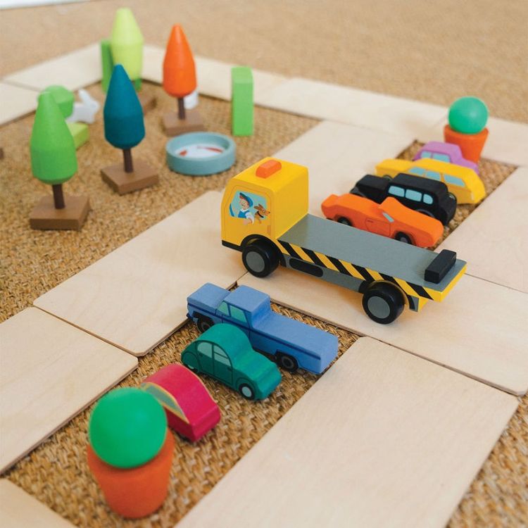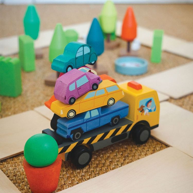 7 masini de jucarie din lemn premium, colorate in nuante vesele, sunt pe drum spre centrul de reciclare! Testeaza-ti indemanarea si echilibrul asezandu-le una peste alta pe camionul cu roti special pentru transport. Un joc distractiv pentru intreaga familie, care ajuta la dezvoltarea abilitatilor motorii fine si a coordonarii mana-ochi la cei mici.