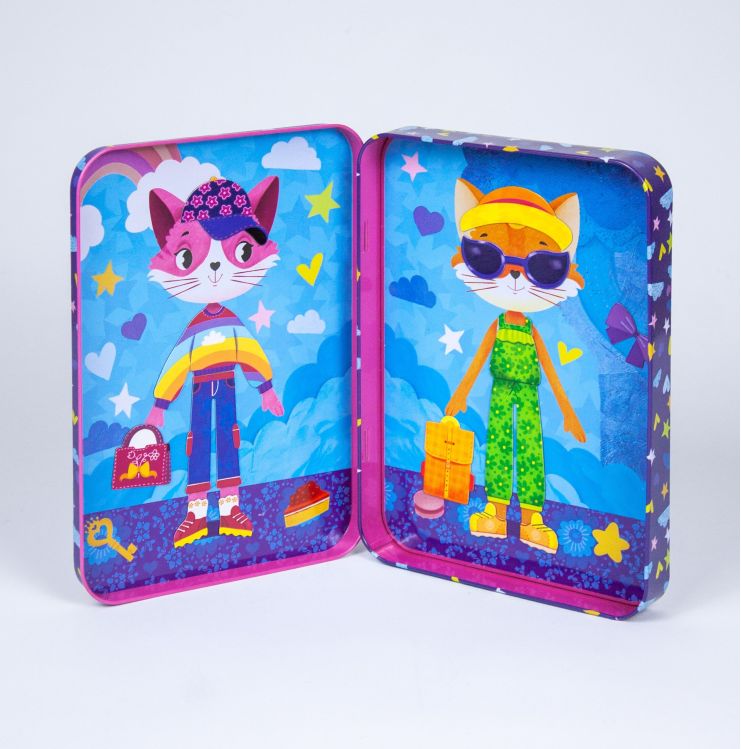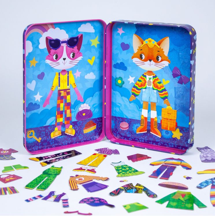 Paseste in universul fascinant al modei si dezvolta-ti simtul estetic si imaginatia in timp ce combini cat mai creativ cei peste 45 de magneti din cutie! Poti crea cele mai inedite combinatii si tinute pentru pisicuta si vulpea care vor sa fie in ton cu moda. Cu o multime de haine si accesorii moderne si asortate, distractia nu are limite! In cutie vei gasit trei planse magnetice, dar poti lipi magneti si pe cele doua parti ale cutiei.