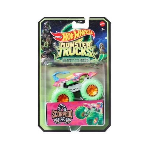 Actiunea devine si mai palpitanta atunci cand luminile se sting iar masinile Hot Wheels Monster Truck se aprind Vehiculele Monster Truck sunt puternice au roti uriase si au un aspect agresiv. Cel mai mare circuit din lume pentru vehiculele Monster Truck este pregatit sa gazduiasca o cursa grandioasa cu noile masinute Acest pachet contine personajul Scorpedo.