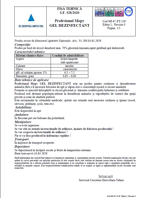 Gel dezinfectant Mopy este un produs de calitate, are proprietăți biocide recunoscute și este special conceput pentru a oferi siguranță și confort, atunci când știi că ai mâinile perfect curate și dezinfectate. Poți ține acasă sau la job flaconul de 1 l care conține cu Mopy profesional, în acest fel ești sigur că ai mereu cantitatea necesară pentru a-ți curăța mâinile cu eficiența.