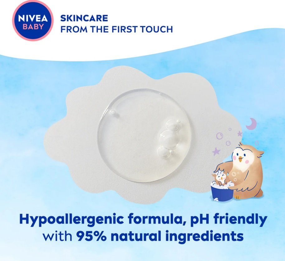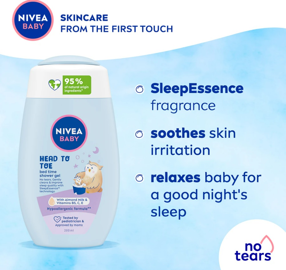 Gelul de duș unic NIVEA BABY Bed Time pentru întregul corp și păr vă va aduce bucurie atât dvs. cât și bebelușului în timpul ritualurilor de îmbăiere. Conține tot ce este important pentru îngrijirea corectă a pielii bebelușului, plus tehnologia SleepEssence, pentru a ajuta la destinderea bebelușului înainte de culcare și pentru a favoriza un somn sănătos.